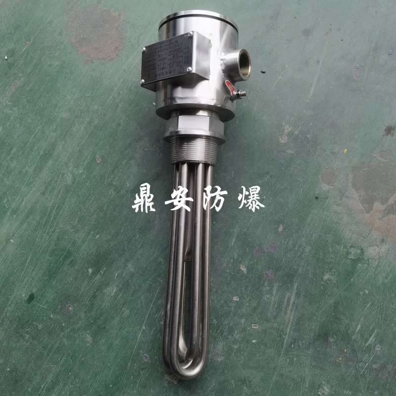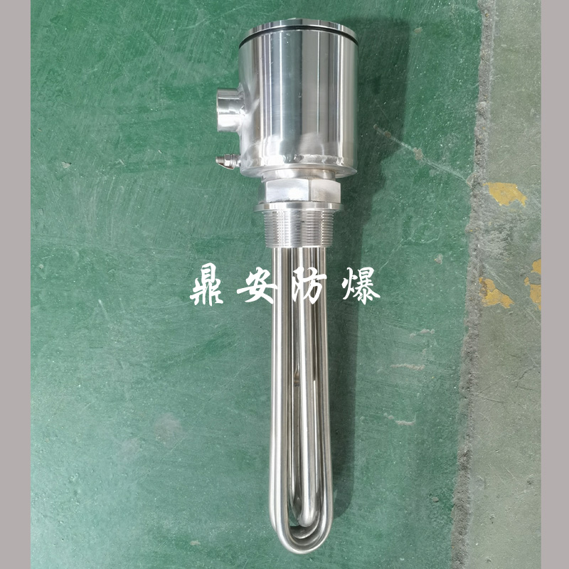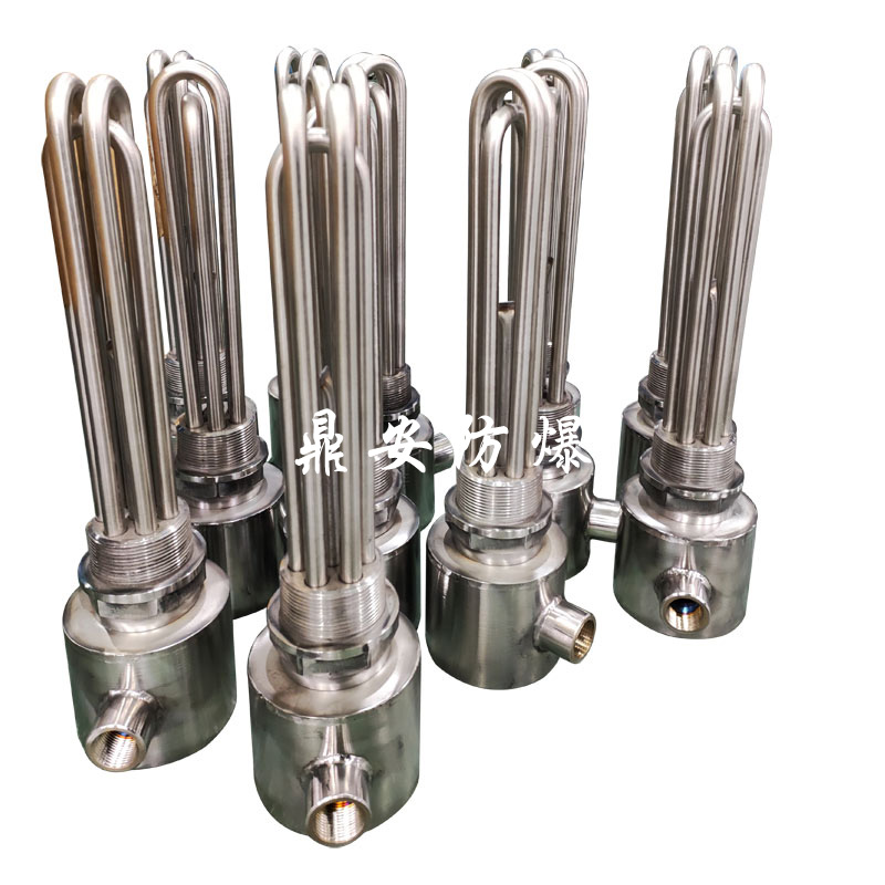 防爆法蘭電加熱管(也稱插入式電加熱器):是采用U型管狀電熱元件,依據加熱不同介質設計規范,按照功率配置要求裝配在法蘭蓋上,插入需加熱物料中,發熱元件工作時所發出的大量熱量傳導給被加熱介質使介質溫度升高,達到所需的工藝要求。當介質溫度達到工藝要求的設定值時,控制系統根據溫度傳感器信號,經PID 運算后調節電加熱器輸出功率,對發熱元件的電阻性負載實現溫度控制。使介質溫度均勻,達到所需要求;當發熱元件超溫或低液位時,發熱元件的聯鎖保護裝置立即切斷加熱電源避免發熱元件燒壞,延長使用壽命。