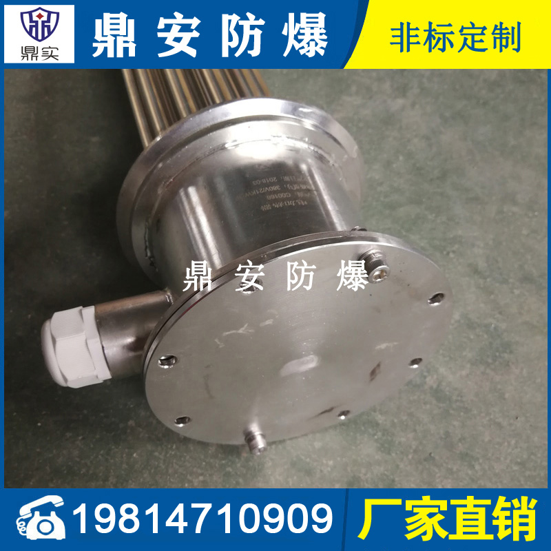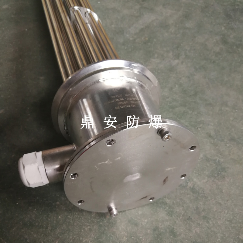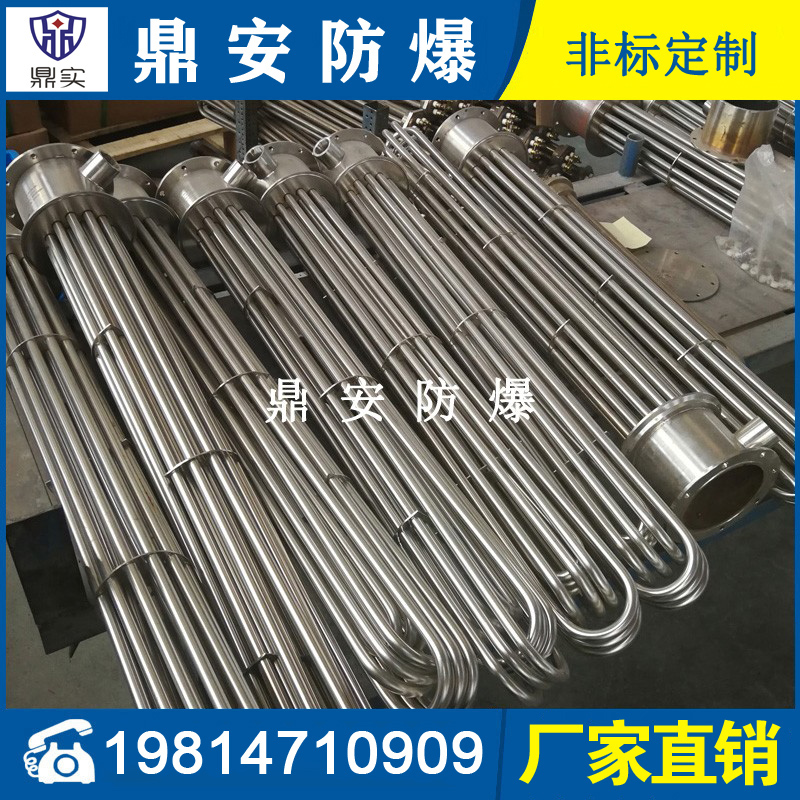 法蘭電熱管(也稱插入式電加熱器):是采用U型管狀電熱元件,多支U型電熱管焊接在法蘭上集中加熱,依據加熱不同介質設計規范,按照功率配置要求裝配在法蘭蓋上,插入需加熱物料中,發熱元件工作時所發出的大量熱量傳導給被加熱介質使介質溫度升高,達到所需的工藝要求,主要用于敞開式、封閉式的溶液箱和循環系統中加熱用。