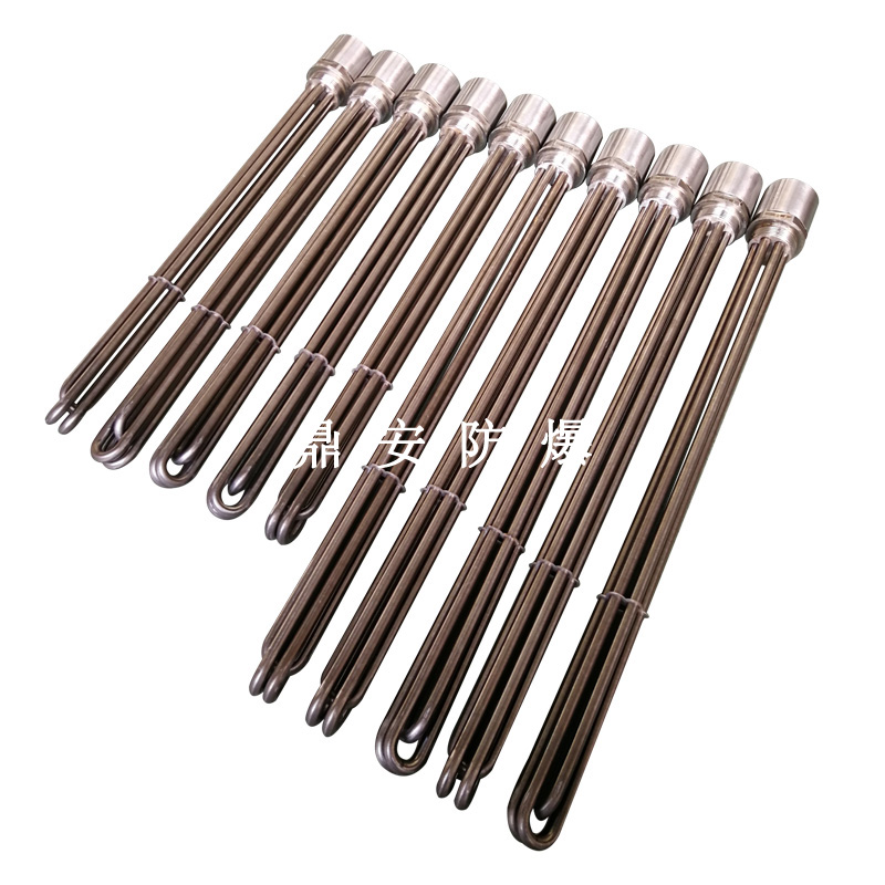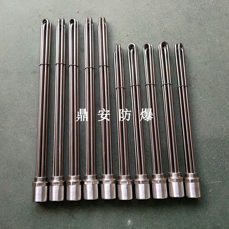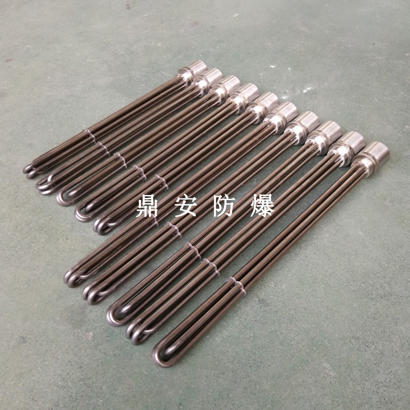 法蘭電熱管(也稱插入式電加熱器):是采用U型管狀電熱元件,多支U型電熱管焊接在法蘭上集中加熱,依據(jù)加熱不同介質(zhì)設(shè)計(jì)規(guī)范,按照功率配置要求裝配在法蘭蓋上,插入需加熱物料中,發(fā)熱元件工作時(shí)所發(fā)出的大量熱量傳導(dǎo)給被加熱介質(zhì)使介質(zhì)溫度升高,達(dá)到所需的工藝要求,主要用于敞開(kāi)式、封閉式的溶液箱和循環(huán)系統(tǒng)中加熱用。