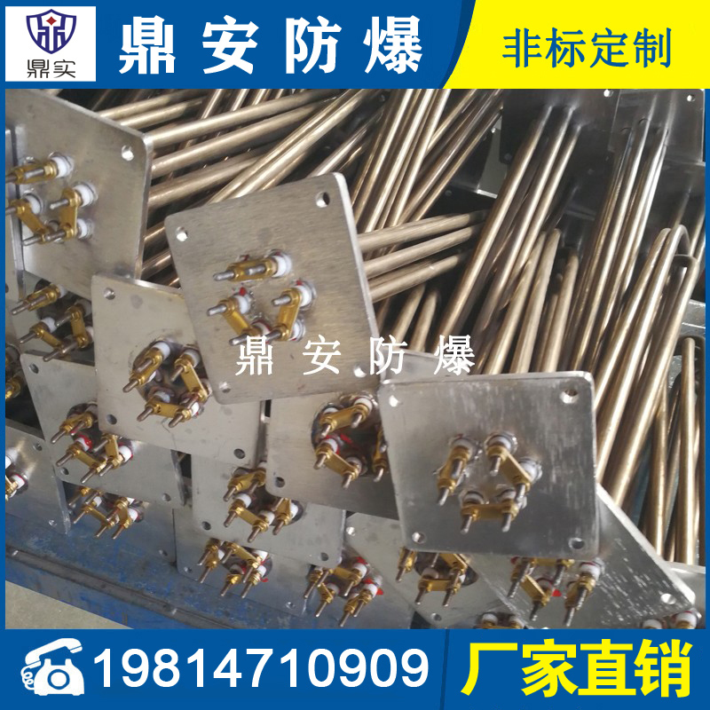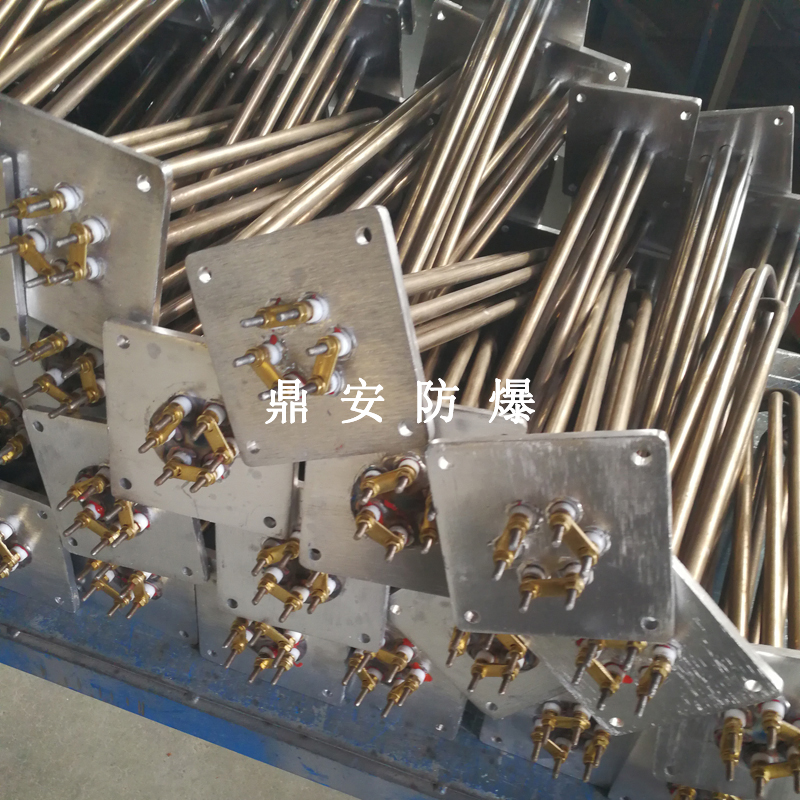 法蘭電熱管(也稱插入式電加熱器):是采用U型管狀電熱元件,多支U型電熱管焊接在法蘭上集中加熱,依據加熱不同介質設計規范,按照功率配置要求裝配在法蘭蓋上,插入需加熱物料中,發熱元件工作時所發出的大量熱量傳導給被加熱介質使介質溫度升高,達到所需的工藝要求,主要用于敞開式、封閉式的溶液箱和循環系統中加熱用。