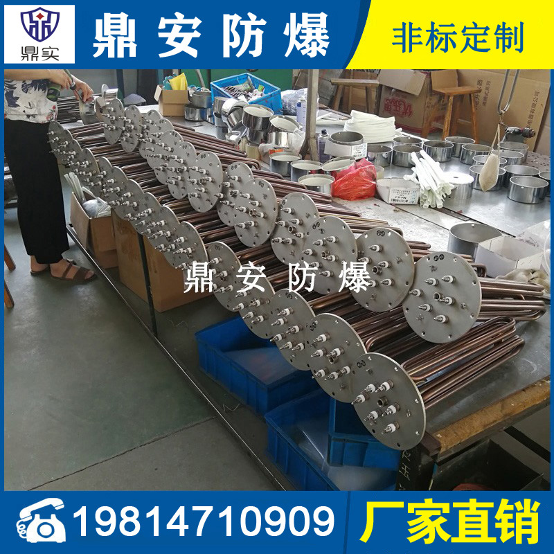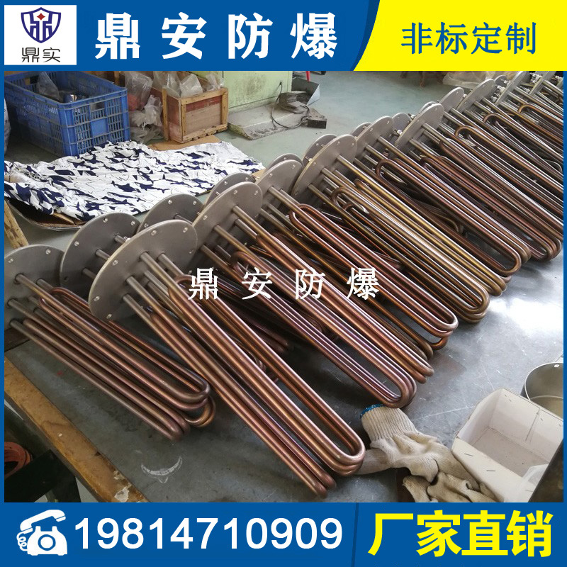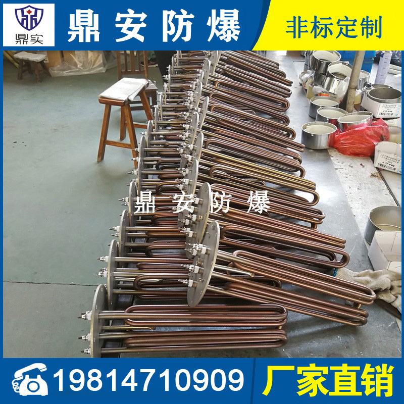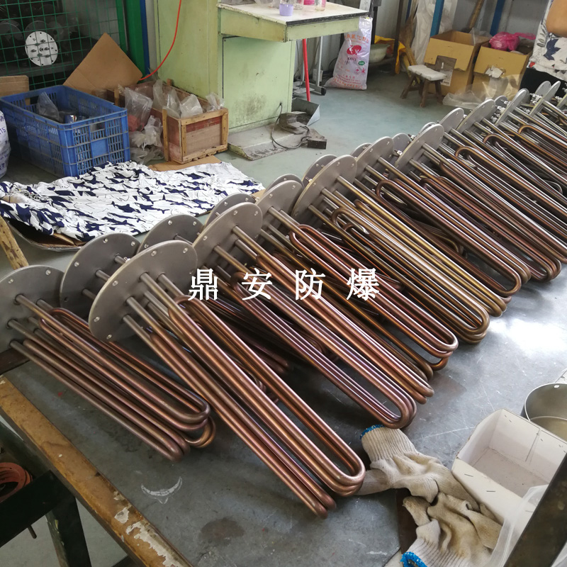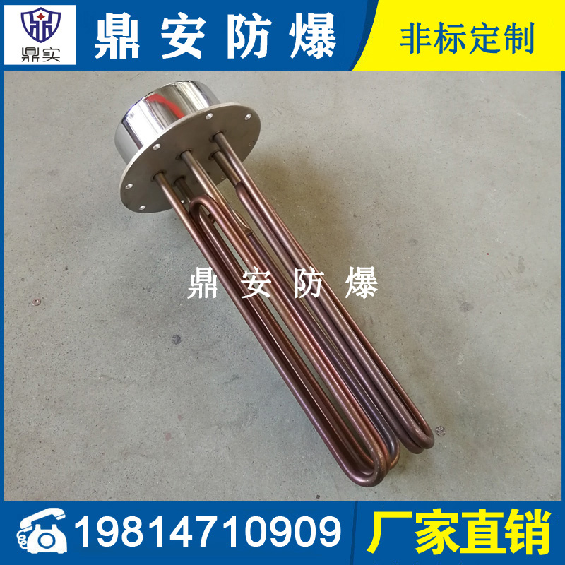 法蘭電熱管(也稱插入式電加熱器):是采用U型管狀電熱元件,多支U型電熱管焊接在法蘭上集中加熱,依據加熱不同介質設計規范,按照功率配置要求裝配在法蘭蓋上,插入需加熱物料中,發熱元件工作時所發出的大量熱量傳導給被加熱介質使介質溫度升高,達到所需的工藝要求,主要用于敞開式、封閉式的溶液箱和循環系統中加熱用。