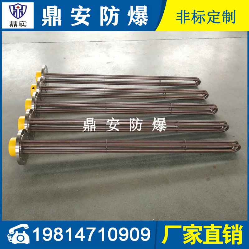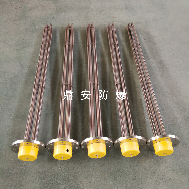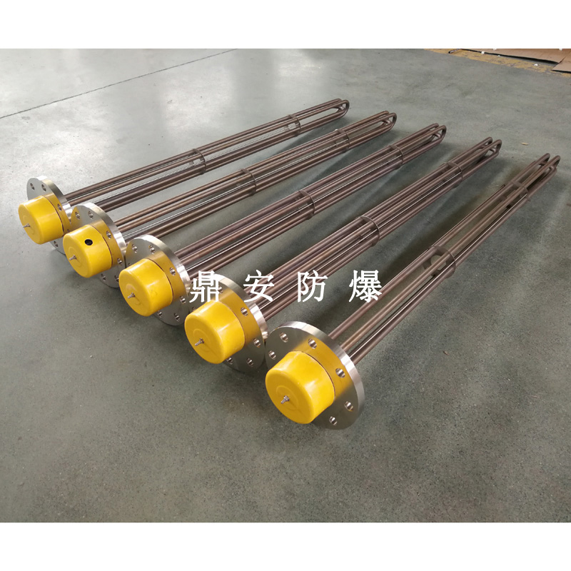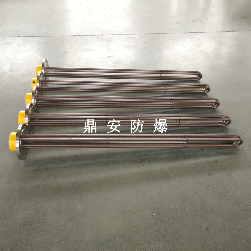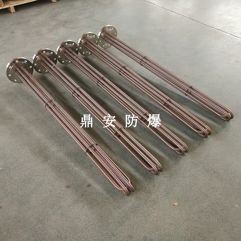 法蘭電熱管(也稱插入式電加熱器):是采用U型管狀電熱元件,多支U型電熱管焊接在法蘭上集中加熱,依據(jù)加熱不同介質(zhì)設(shè)計規(guī)范,按照功率配置要求裝配在法蘭蓋上,插入需加熱物料中,發(fā)熱元件工作時所發(fā)出的大量熱量傳導(dǎo)給被加熱介質(zhì)使介質(zhì)溫度升高,達到所需的工藝要求,主要用于敞開式、封閉式的溶液箱和循環(huán)系統(tǒng)中加熱用。