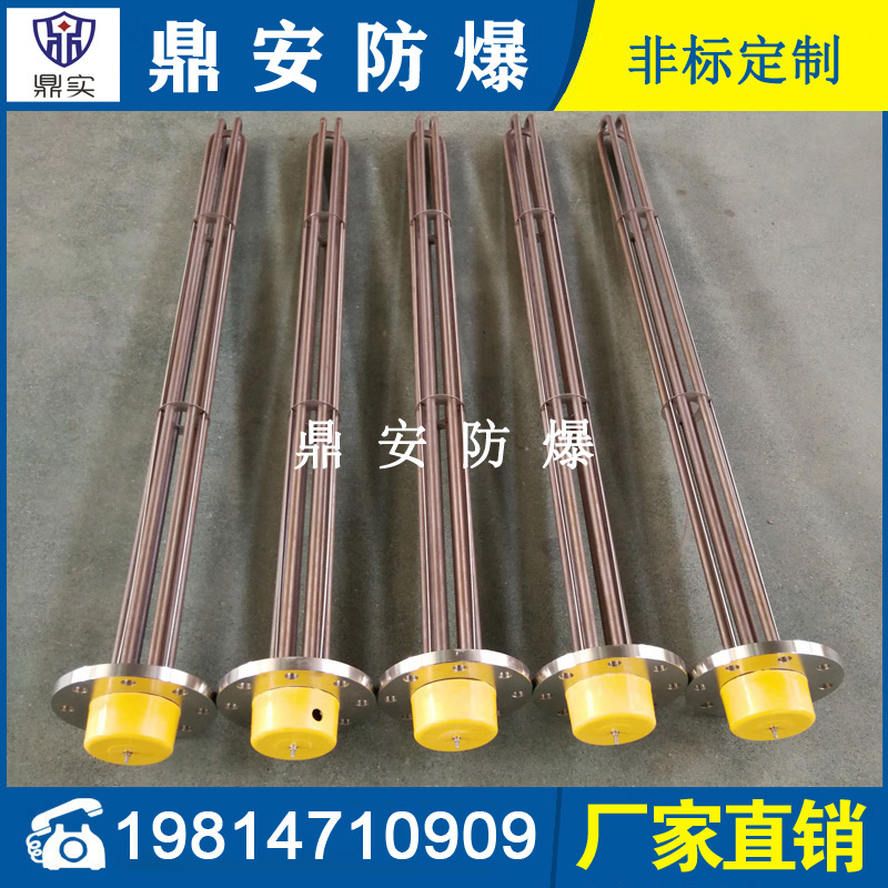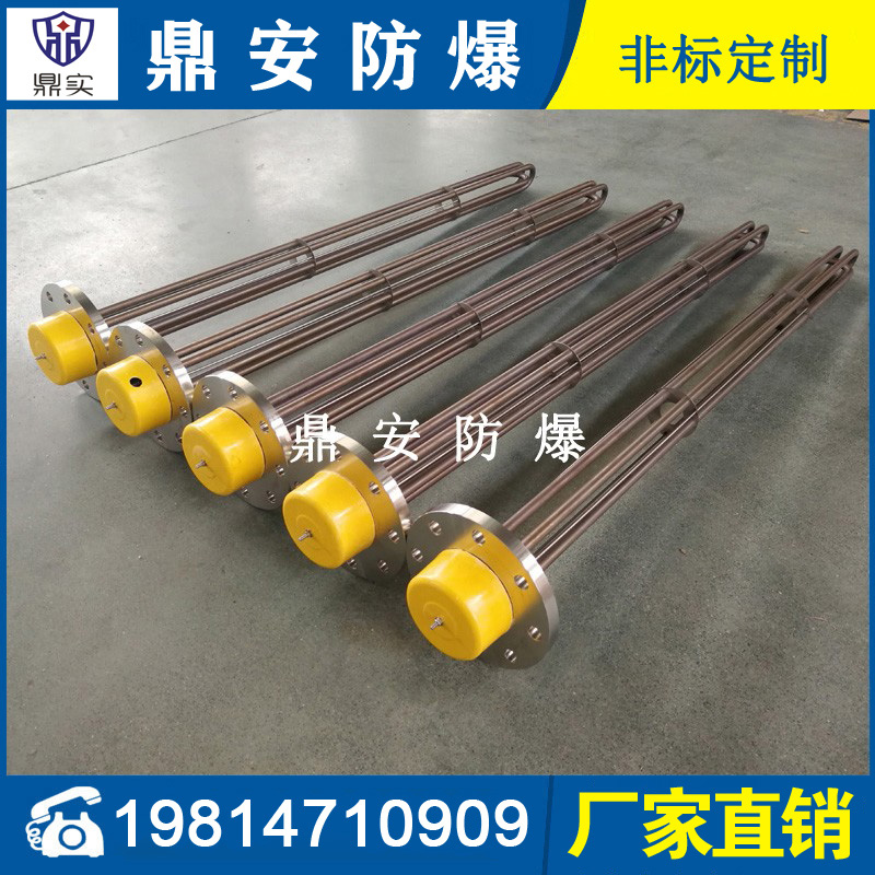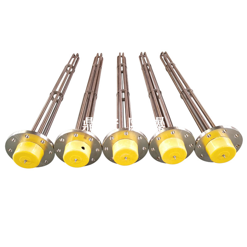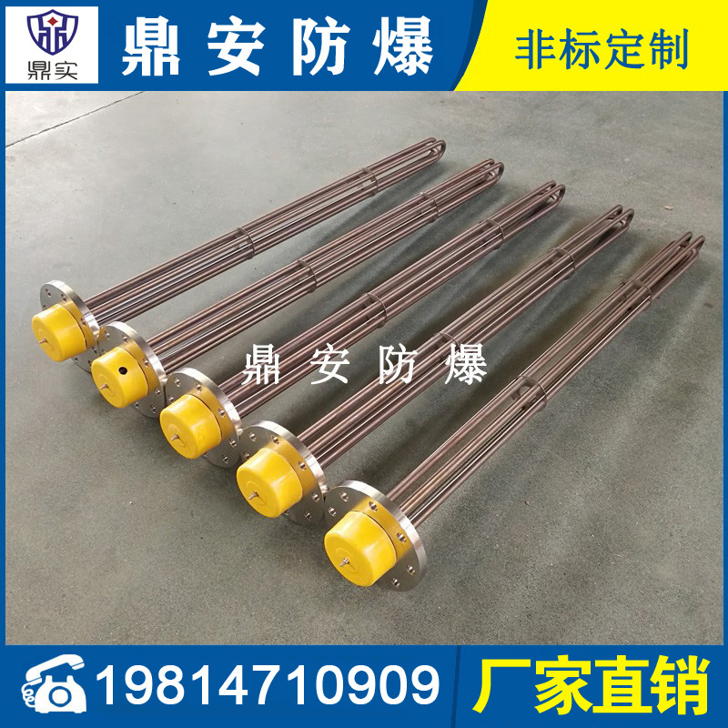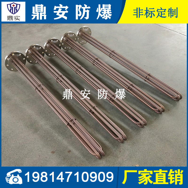 法蘭電熱管(也稱插入式電加熱器):是采用U型管狀電熱元件,多支U型電熱管焊接在法蘭上集中加熱,依據(jù)加熱不同介質(zhì)設(shè)計規(guī)范,按照功率配置要求裝配在法蘭蓋上,插入需加熱物料中,發(fā)熱元件工作時所發(fā)出的大量熱量傳導(dǎo)給被加熱介質(zhì)使介質(zhì)溫度升高,達到所需的工藝要求,主要用于敞開式、封閉式的溶液箱和循環(huán)系統(tǒng)中加熱用。