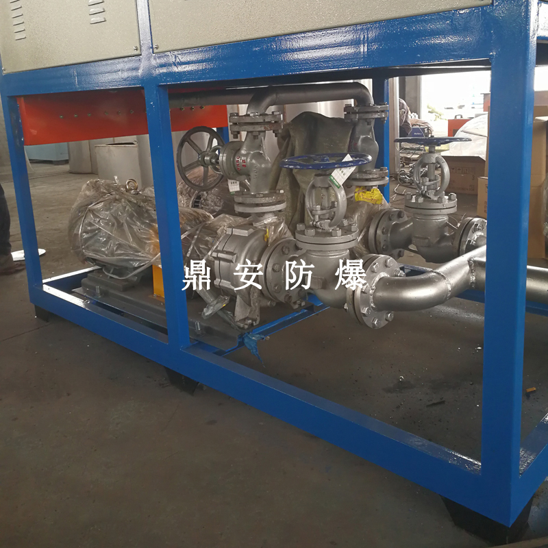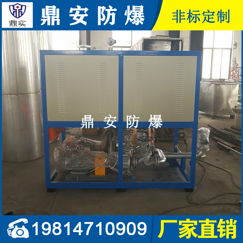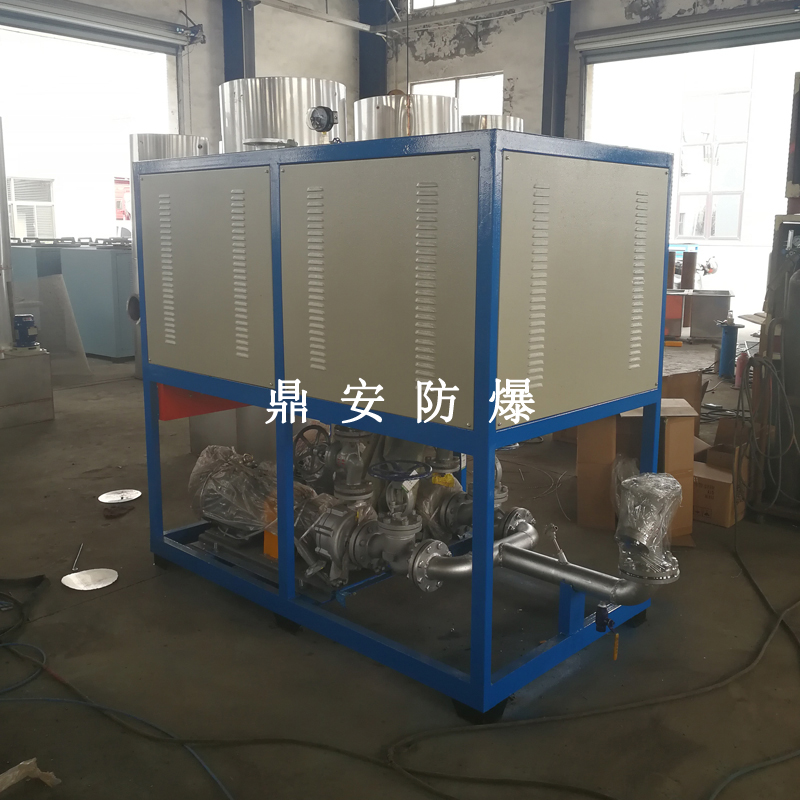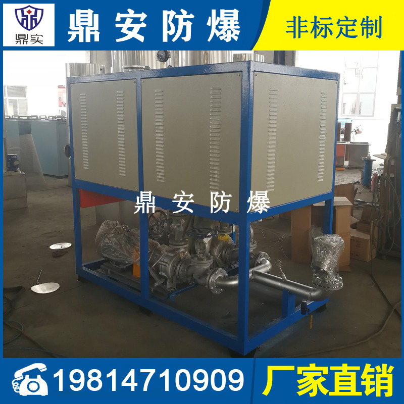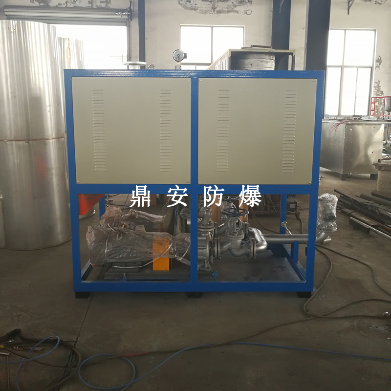 導熱油加熱機組(又稱電加熱導熱油爐)由防爆電加熱器、有機熱載體爐、換熱器(可配置)、控制柜,熱油泵、膨脹槽等組成一個整體的系統,用戶只需要接入電源、介質的進出口管道法蘭及一些電氣接口即可使用。具有完備的運行控制和安全監測裝置,能實行自動化控制。能在較低的運行壓力下獲得較高的工作溫度。